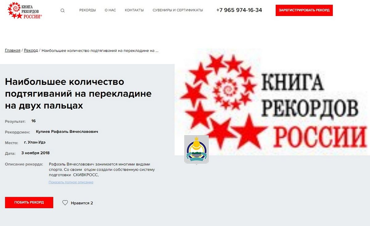 В начале этого месяца, 3 ноября 25-летний спортсмен Рафаэль Кулиев из Бурятии попал в книгу рекордов России. Он выполнил наибольшее количество подтягиваний на перекладине на двух пальцах. Это удалось ему повторить шестнадцать раз.