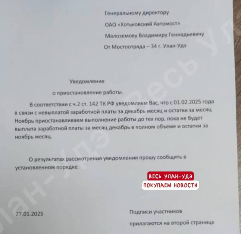 Как сообщает телеграм-канал «Весь Улан-Удэ», рабочие устроили забастовку и отказались продолжать трудиться бесплатно. Зарплату не выплатили за декабрь полностью и за часть ноября. Строители написали уведомление на имя гендиректора «Хотьковского автомоста».