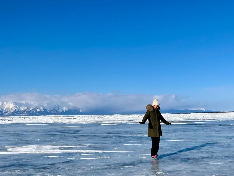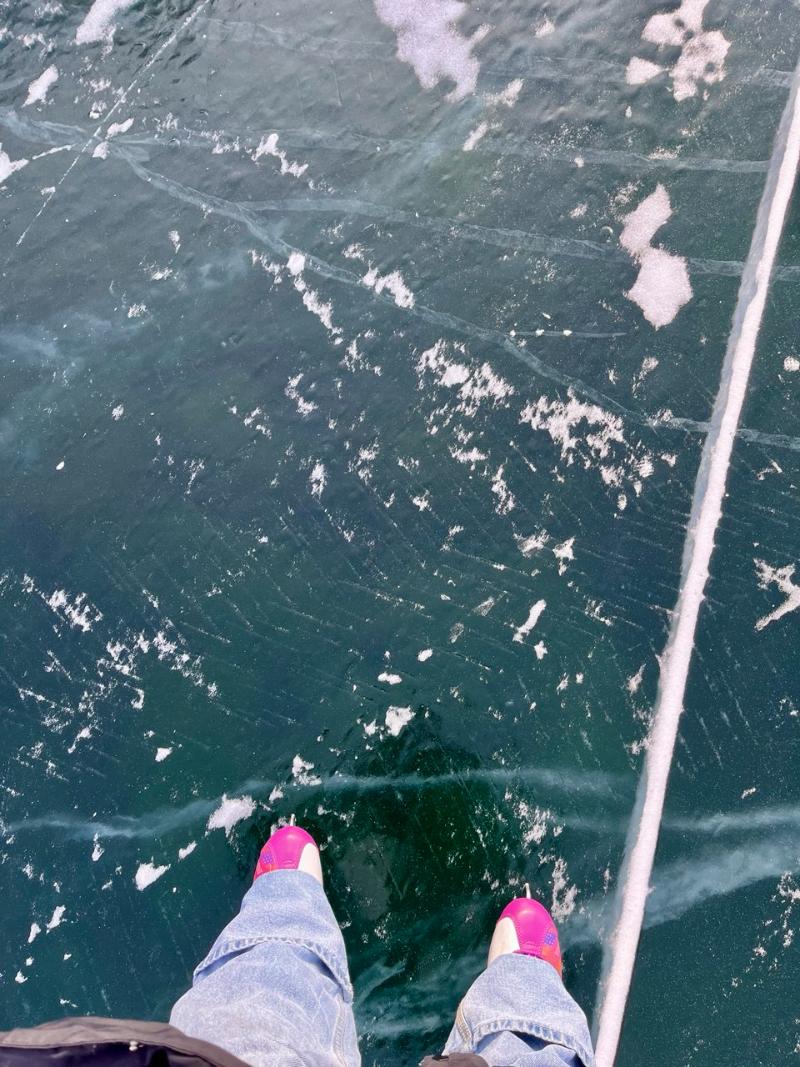 Дорога от берега до середины озера заняла около 20 минут. Раньше я думала, что лед специально отчищают от снега в определенных местах для туристов. Оказалось, что ветер справляется с этой задачей гораздо лучше. У моего коллеги Саши забилось сердечко от ощущения бескрайности воды — словно в бездну вглядываешься.