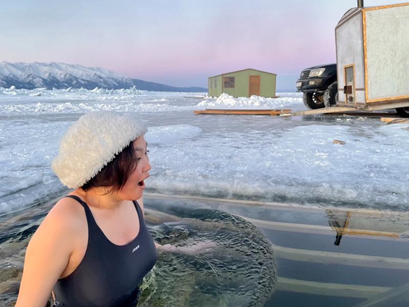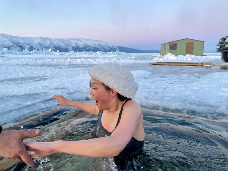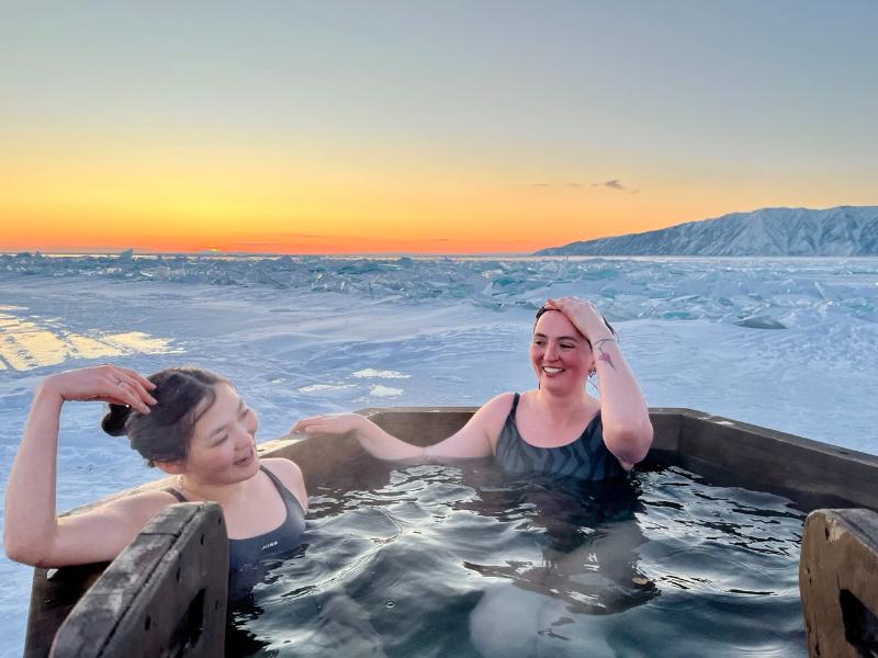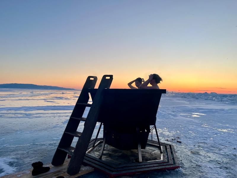 Мы выбежали из автобуса и сразу же окунулись в чан с горячей водой. Сначала тебя окутывает холодный воздух, который пробирает за секунду. А потом — бурлящее тепло. Неподалеку от чана сделали прорубь с деревянными ступенями. Согревшись и полюбовавшись золотым закатным солнцем, ты покидаешь чан, бежишь к проруби и погружаешься в холодную байкальскую воду. И поначалу ничего не чувствуешь, только легкие покалывания. А затем холод вытесняет тепло и словно наступает перезагрузка. Мозг отключается, и остаются лишь инстинкты. И вот, даже не осознавая, ты бежишь к чану, чтобы поскорее согреться. И так несколько раз. Драйв нереальный. Так мы покупались около 30 минут, самые стойкие продержались и подольше.