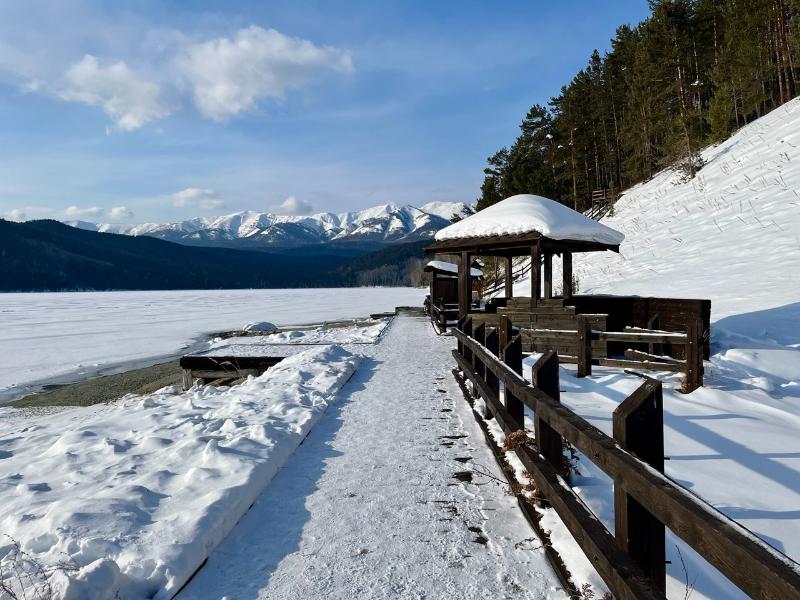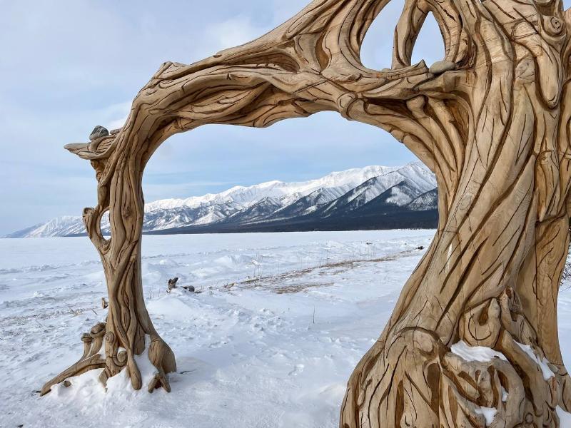 Проехав половину пути до озера, мы решили остановиться недалеко от входа на «Тропу испытаний». Не так давно там появилась волшебная фотозона — высокая арка из дерева, напоминающая перекаты волн. Смотришь и видишь невероятной красоты пейзаж: заснеженные верхушки гор, глубокое голубое небо. Словно перед тобой открывается портал, который поведет тебя в сказку. На ум приходят легенды о призрачной коннице или хозяине Ольхона. Сделали десятки фотографий на память и вновь отправились в путь.