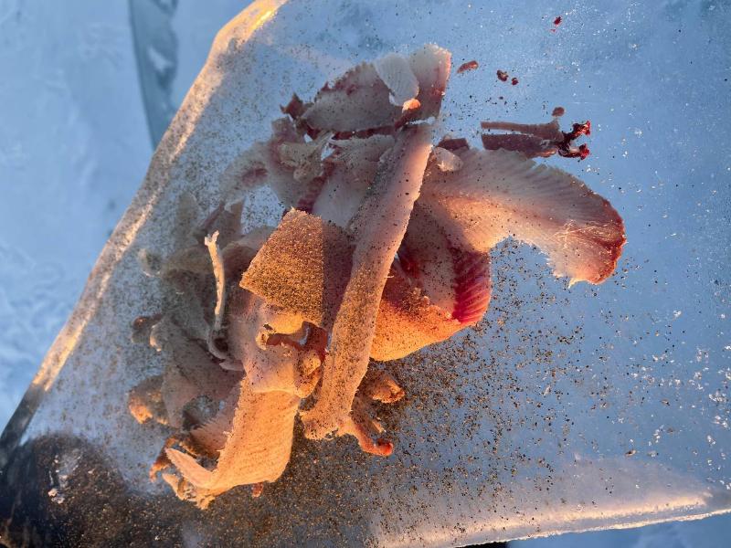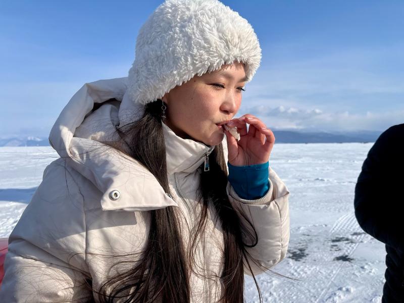 Дальше на «буханке» мы двинулись к самому оживленному месту на Байкале в тот день. В пятнадцати минутах от острова находится зона для ловли рыбы. Как нам рассказал водитель, это единственное место , где зимой разрешена подледная рыбалка в их районе. В рамках нашего тура спиннинг и ледобур оказались при нас. Сделали лунку, закинули наживку и замерли в ожидании улова. Даже аффирмацию сделали на крупный улов. Но, увы, омуль в этот день к нам не торопился. Но не стали унывать и решили попросить поделиться уловом более удачливых рыбаков. Подошли к местным, и нас угостили свеженькой рыбкой. И даже сделали расколотку. Свежую, но уже замерзшую рыбу очистили и каждому дали по кусочку. Его нужно было окунуть в смесь из соли и перца и съесть. Именно тогда я впервые поняла значение фразы «таит во рту». Не знаю, атмосфера в целом так повлияла или же так ярко вкус омуля раскрывается только в первые часы, но эта гастрономическая часть нашего тура навсегда останется в сердце.