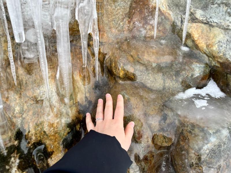 На самом деле нам даже толком не сказали, зачем мы туда направляемся. И я наивно полагала, что мы будем смотреть на птиц. А потом мы увидели свисающие со скал льдины. Застывшие волны высотой в несколько метров вот–вот должны были обрушиться вниз, но стояли неподвижно, как пуховое покрывало. Ледяной покров и гроты создавали мистическую атмосферу, окутанную легендами. Ощущение, что пробираешься в замок Снежной королевы. Внутри небольших пещер звенящая тишина. Причем глыбы льда были разные: белые, прозрачные, цветные. Разумеется, все обморозили руки, пока трогали застывшую воду, но уходили мы оттуда нехотя.
