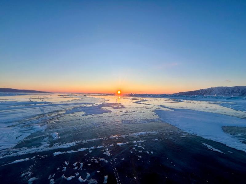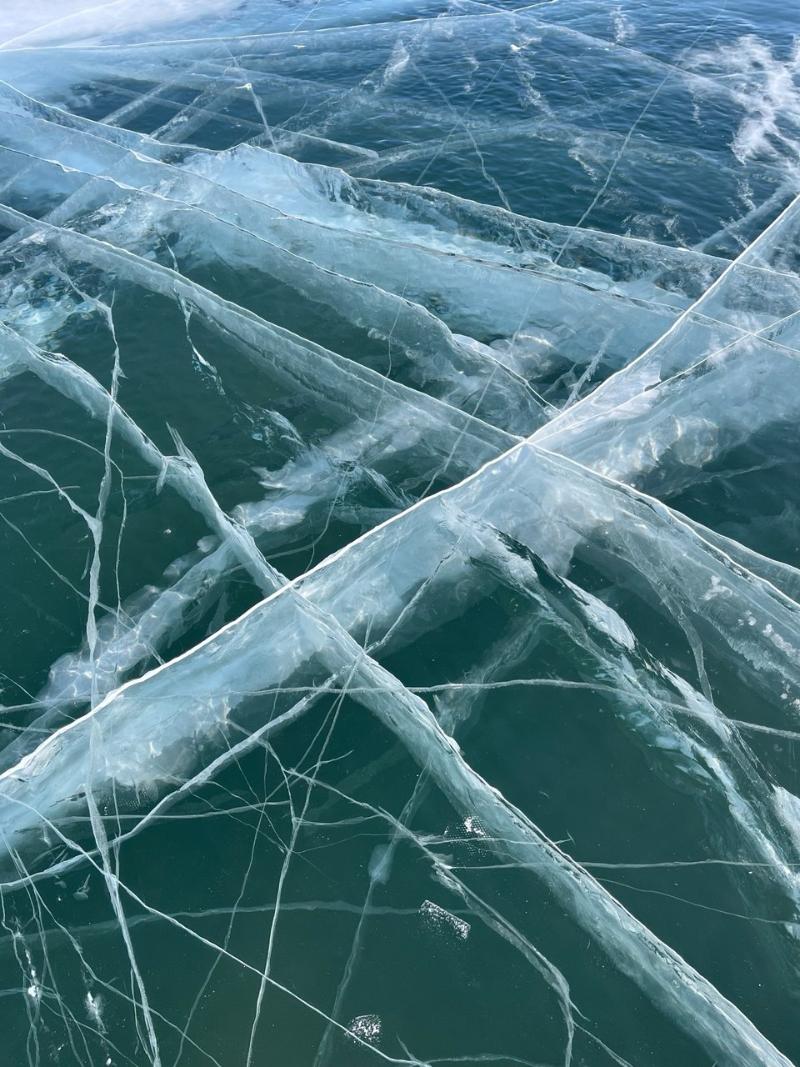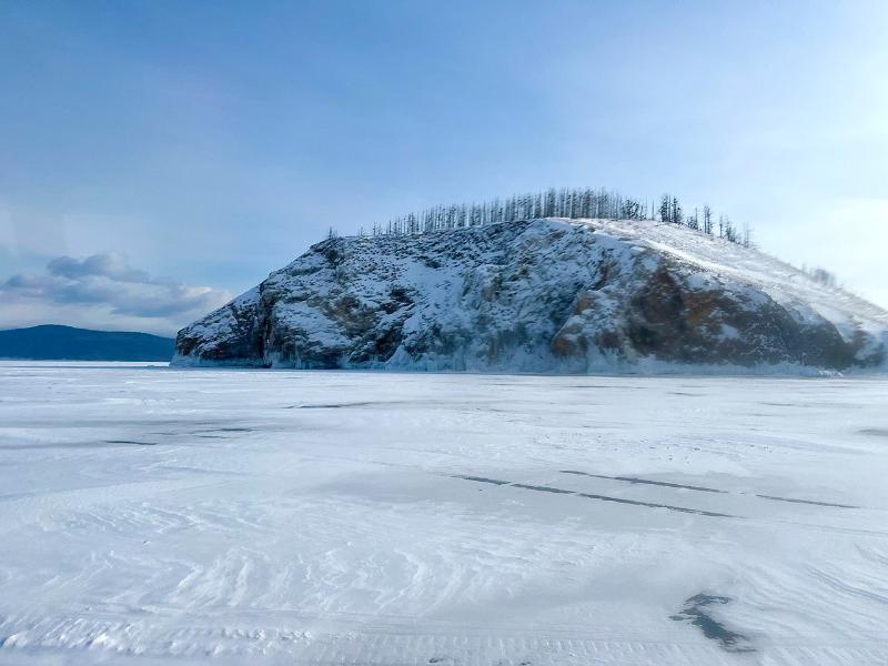 И вот долгожданный выезд на лед. Когда мы поняли, что едем по воде, пусть и замерзшей, у Александра случился легкий сердечный приступ, а я всё никак не могла поверить, что это совершилось! Спустя минут 10 дороги начали появляться участки льда без снега — темные пятна сияли на солнце, а в салоне стоял гул: «Мы едем по Байкалу». И путь наш лежал к одному из островов озера — Малому Кылтыгею.