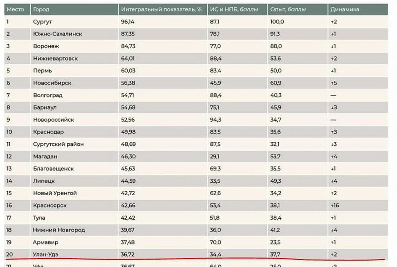 Однако, высокий итоговый результат для Улан-Удэ обеспечил второй показатель — «Проектный опыт». В нем Улан-Удэ занял очень высокое 13 место по стране с 37,7 баллами. В нем аналитики рассматривали количество и качество проектов с участием инвесторов, которые реализованы или находятся в работе.