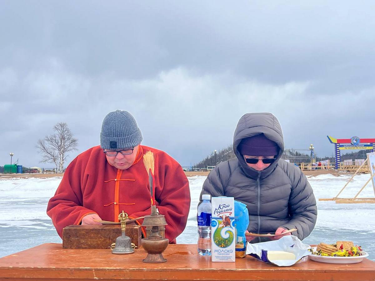 Проректор Буддийского университета Жаргал Багша по традиции провел обряд почитания и умилостивления хозяев местности. А представитель Русской православной церкви окропил участки для рыбаков, сцену и призы святой водой.
