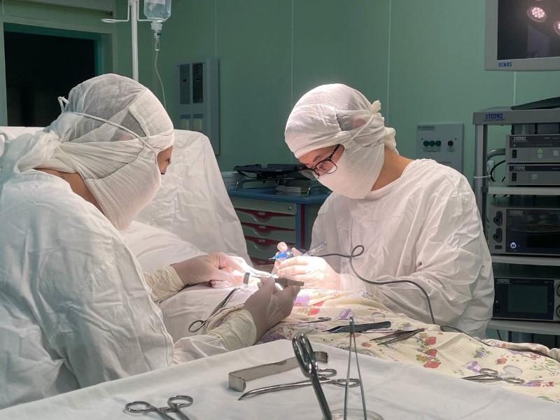Хирург удалил камень размером 9 мм в нижней трети мочеточника с помощью урологического лазера и установил стент в мочеточник для восстановления оттока мочи.