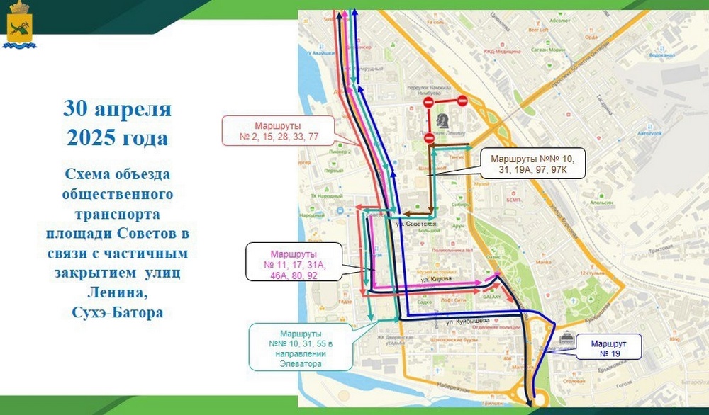 Сегодня, 30 апреля, в Улан-Удэ частично перекроют центральные улицы – Сухэ-Батора и Ленина. С 13:00 до 22:00 на площади Советов будет проходить репетиция военного парада.