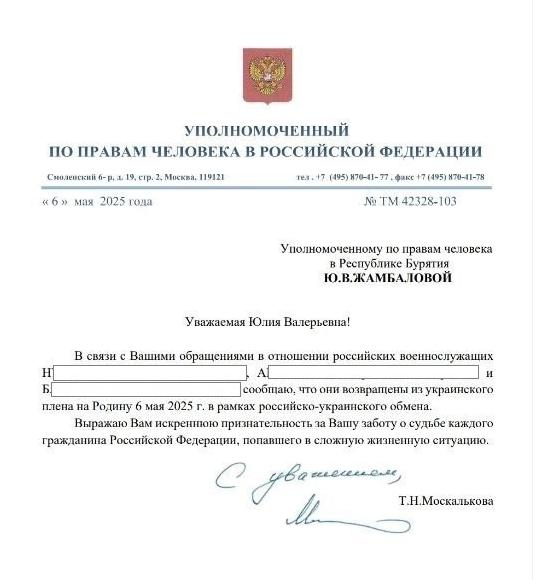— Мы продолжаем работу в отношении тех ребят, которые еще находятся в плену, верю, что они тоже скоро будут дома. Сил и терпения. В настоящее время все российские военнослужащие находятся на территории Беларуси, где им оказывается вся необходимая медицинская и психологическая помощь, а также предоставлена возможность позвонить родным. В ближайшее время они будут доставлены в Россию. Выражаю благодарность Министерству обороны РФ, уполномоченному по правам человека РФ Татьяне Москальковой и всем, кто принимал участие в обмене наших ребят, — заключила Юлия Жамбалова.