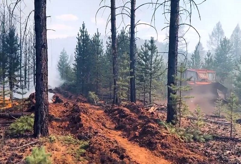 В лесу на пожаре работает 61 человек, два трактора и три автомашины.