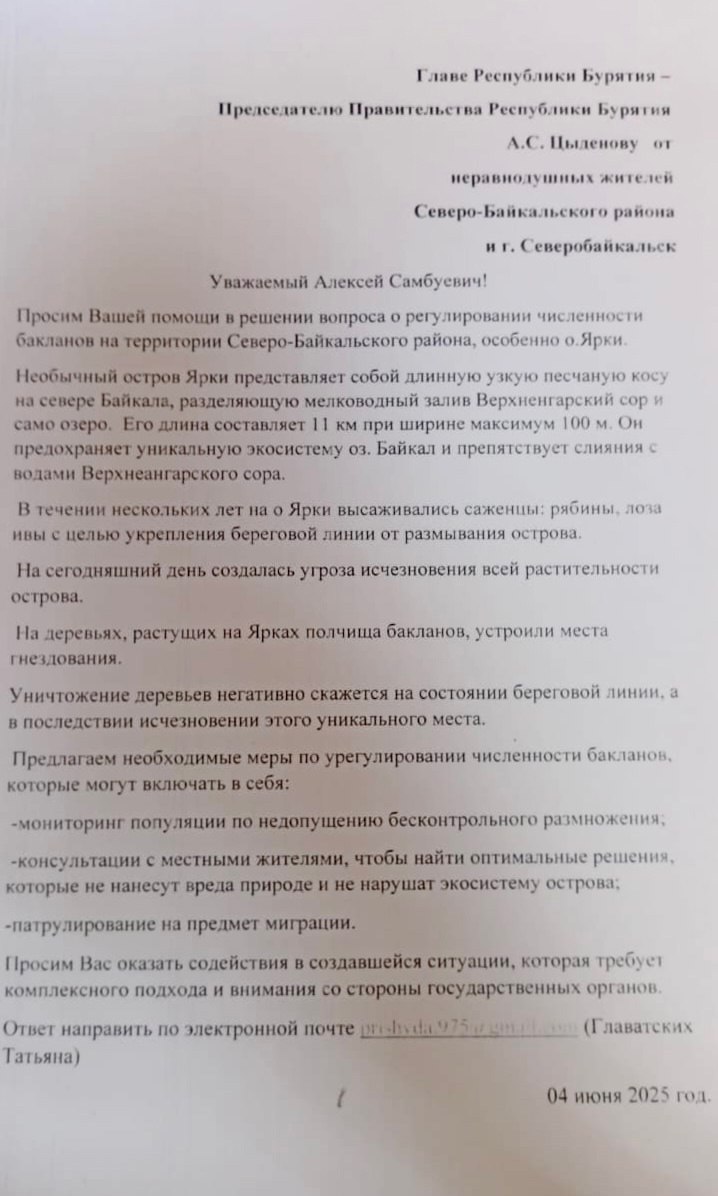Неравнодушные жители Северо-Байкальского района составили письмо на имя Алексея Цыденова. Они просят главу Бурятии решить вопрос о регулировании численности бакланов. Их особенно беспокоит рост численности этих птиц на острове Ярки. Письмо опубликовал у себя в телеграм-канале депутат Народного Хурала Бурятии Александ Парщиков.