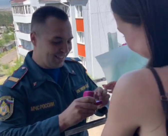Старший пожарный из Бурятии решил креативно сделать предложение любимой. В День семьи, любви и верности он с коллегами по цеху инсценировал пожар в подъезде.