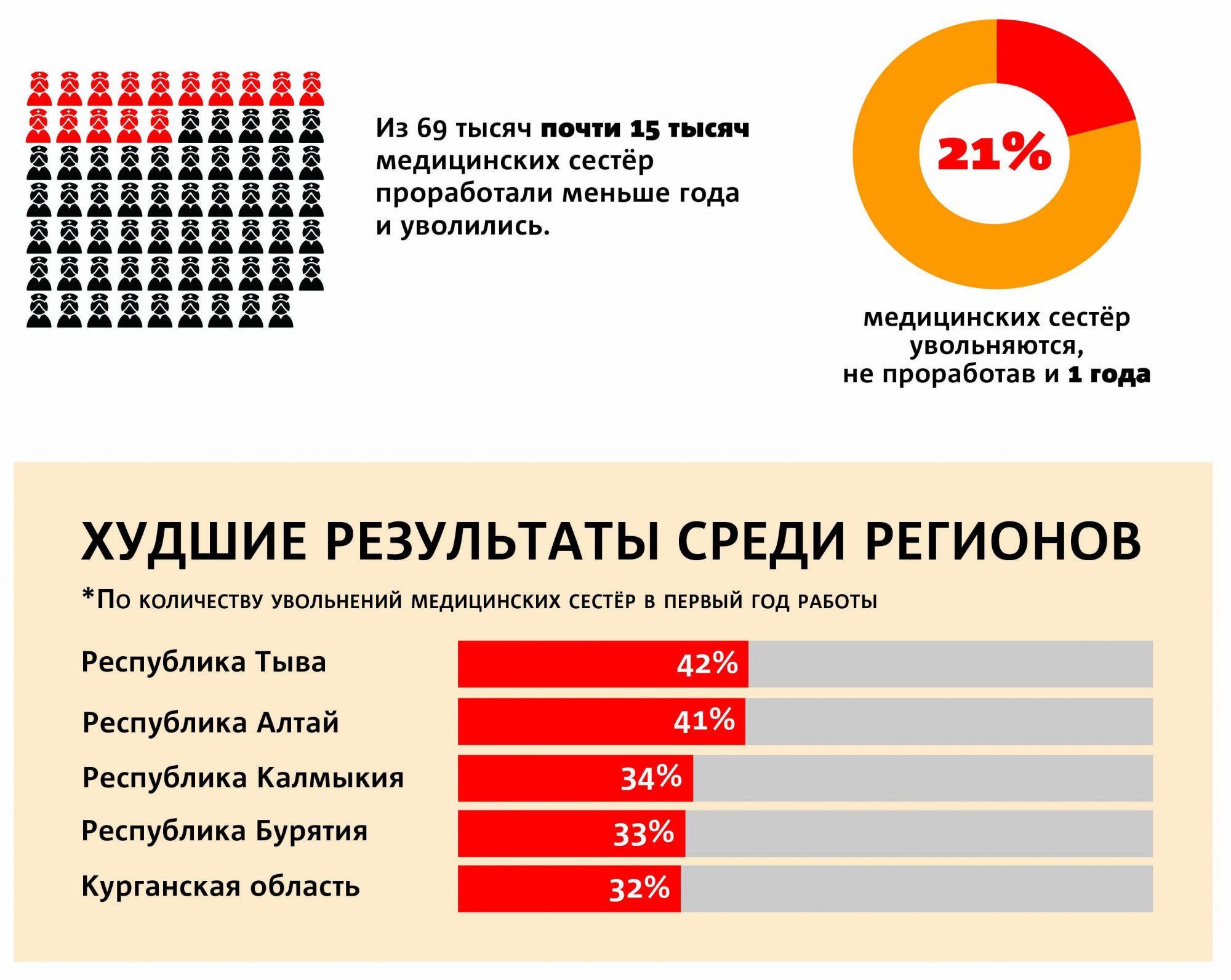Во время конференции «Кадры для современного здравоохранения. Стратегия по снижению дефицита кадров» заместитель министра здравоохранения России Татьяна Семёнова заявила, что 21 % медсестёр в России увольняются из больниц, не проработав там и года. Но 21 % - это лишь усредненный показатель по всей стране. В свою очередь, худшие результаты среди регионов наблюдаются у: Тывы (42 %), Алтая (41 %), Калмыкии (34 %), Бурятии (33 %) и Курганской области (32 %).