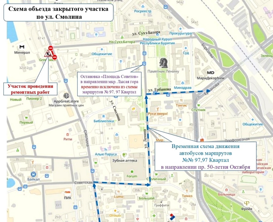 В столице Бурятии с 6 августа временно изменилась схема движения автобусов маршрутов №97 и №97 «Квартал». Как сообщили в комитете по транспорту администрации города, корректировка связана с затруднённым движением на участке улиц Смолина и Ранжурова.