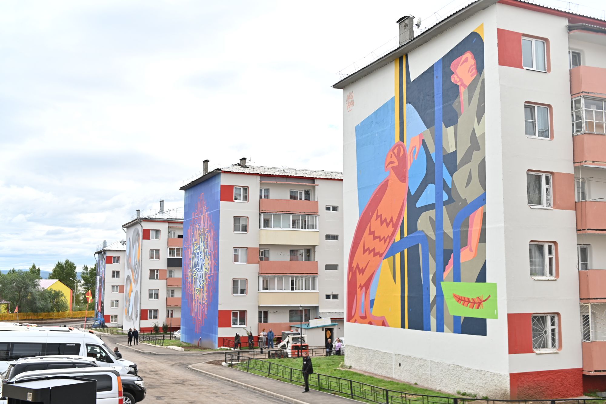 Она также отметила, что муралы фасадов домов созданы в рамках фестиваля Фонда «Смена», который проходит в 14 промышленных городах и поселках по всей стране. Это масштабный российский паблик-арт фестиваль Фонда Мельниченко, тема которого — «Человек градообразующий» — подчеркивает ежедневный труд людей. Саган-Нур стал единственным населенным пунктом, где муралы создавали сразу 5 разных художников. Их работы отразили самобытность региона и разные стороны шахтерского труда.