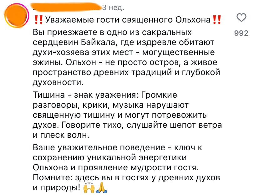«Уважаемые гости священного Ольхона! Вы приезжаете в одно из сакральных сердцевин Байкала, где издревле обитают духи – хозяева этих мест, могущественные эжины. Ольхон не просто остров, а живое пространство древних традиций и глубокой духовности. Тишина – знак уважения: громкие разговоры, крики, музыка нарушают священную тишину и могут потревожить духов. Говорите тихо, слушайте шёпот ветра и плеск волн. Ваше уважительное поведение – ключ к сохранению уникальной энергетики Ольхона и проявление мудрости гостя. Помните: здесь вы в гостях у древних духов и природы!»