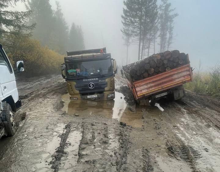 Жители Баунтовского района показали, в каком состоянии находится дорога к Багдарину. На кадрах видно, как большегруз обеими колесами завяз в огромной луже.