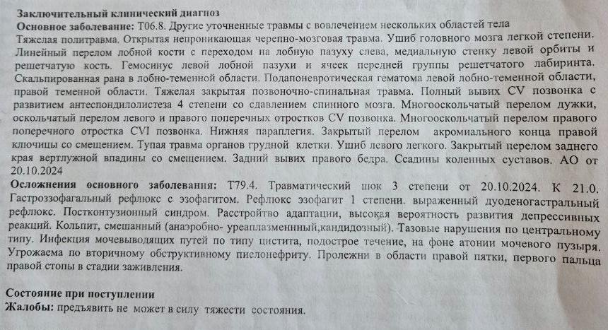 Диагноз оказался тяжёлым. Открытая непроникающая черепно-мозговая травма, ушиб головного мозга лёгкой степени, линейный перелом лобной кости, скальпированная рана в лобно-теменной области, тяжёлая закрытая позвоночно-спинальная травма, переломы позвонков и другие.