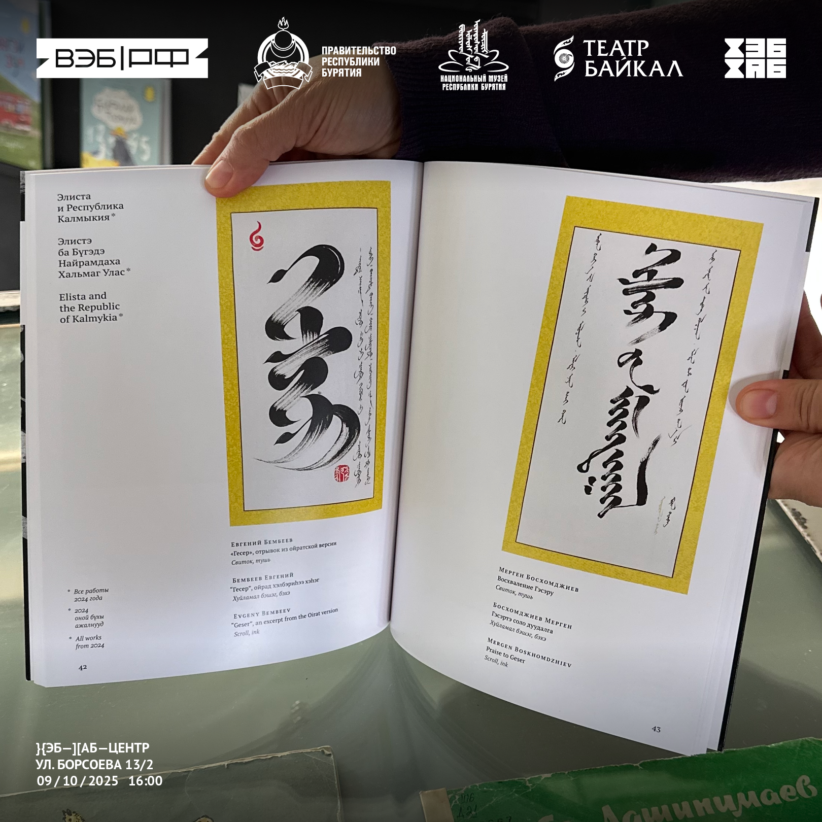 — Авторы работ из этого каталога провели огромную исследовательскую работу: искали материал в первоисточниках, написанных на монгольском письме. Работали с Национальным музеем, Национальной библиотекой, искали статьи и книги в интернете, в домашних архивах. У нас много книг на тему Гэсэриады, написанных на бурятском языке. Некоторые отрывки мы брали оттуда и перекладывали с кириллического бурятского языка на вертикальную письменность. Наследие Гэсэриады — это важное историческое и культурное наследие нашего народа, послужившее вдохновением для современных каллиграфов, — прокомментировала координатор выставки, руководитель студии «Титэм-Арт» Арюна Булгутова.