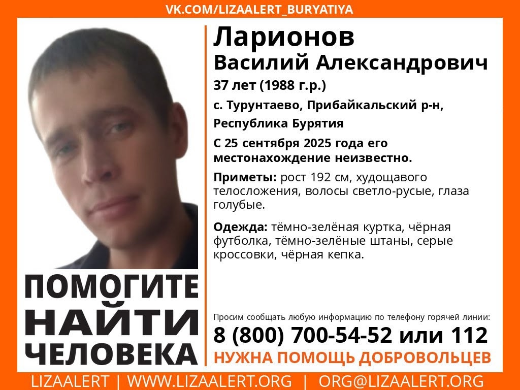 В Бурятии две недели ищут 37-летнего жителя села Турунтаево Прибайкальского района Василия Ларионова.