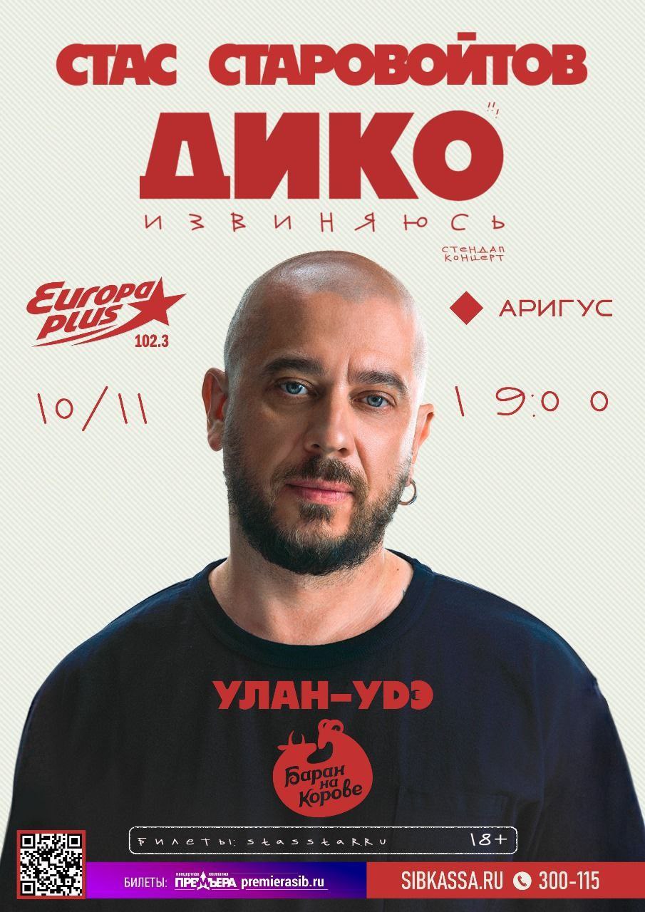 В Улан-Удэ стендап-концерт Стаса Старовойтова с новой программой «ДИКО извиняюсь» состоится 10 ноября в 19:00 на сцене ресторана «Баран на Корове». Билеты на нашем сайте в разделе «ДосҮҮг».