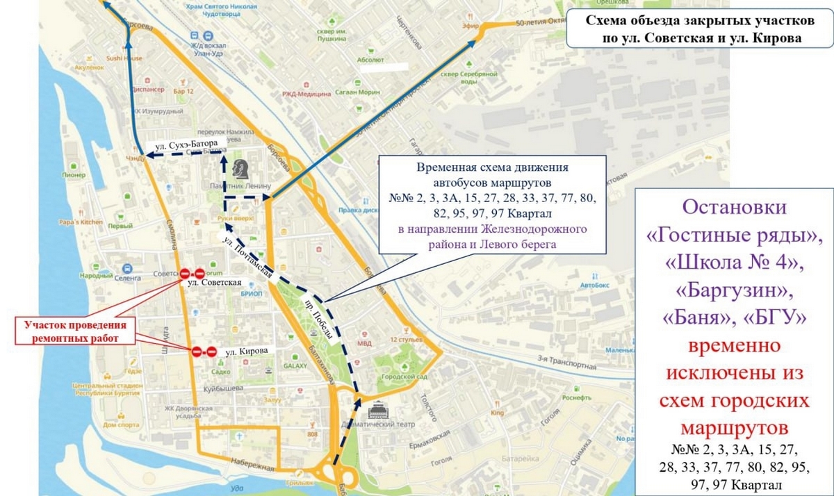 С 23 октября по 23 ноября в центре Улан-Удэ перекроют движение на перекрёстках улиц Советская – Смолина и Кирова – Смолина. Как сообщили в мэрии, ограничения связаны с обновлением коммунальной инфраструктуры.