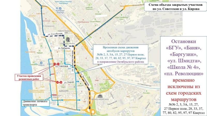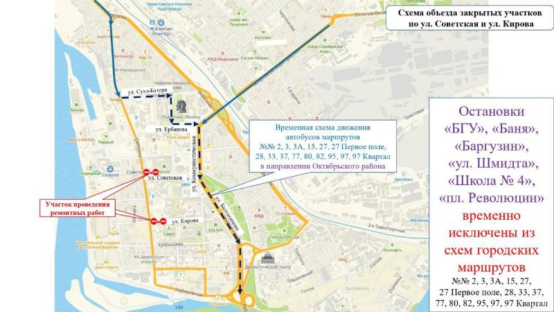Перекроют участки на улице Советская, рядом с остановкой «гостиница Баргузин», и улице Кирова, рядом с остановкой «Школа №4». В связи с этим меняются схемы движения автобусных маршрутов № 2, 3, 3А, 15, 27, 27 «Первое поле», 28, 33, 37, 77, 80, 82, 95, 97 и 97 «Квартал».