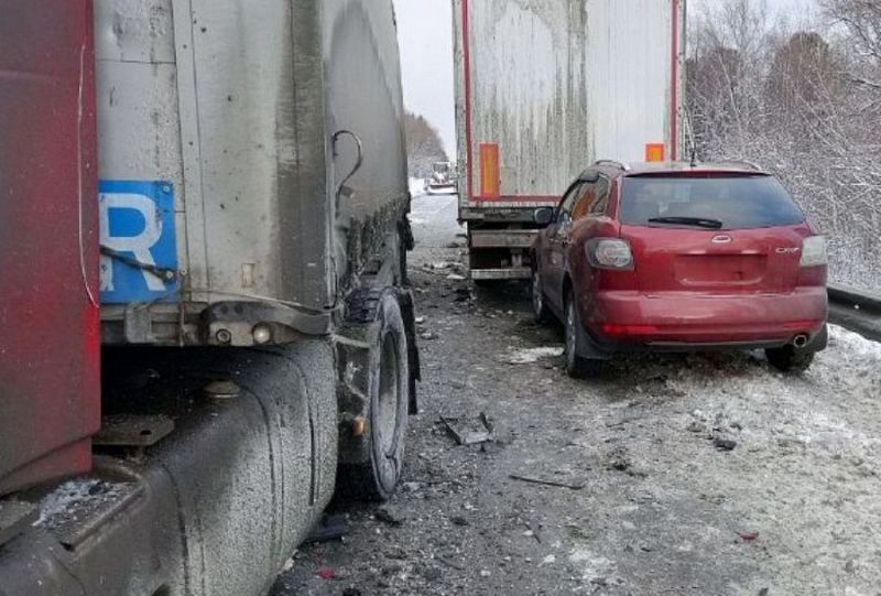 В результате удара «Вольво» оказался на встречной полосе. Там автомобиль столкнулся с другой фурой. Легковушка, которая ехала в противоположную сторону, врезалась в большегруз.