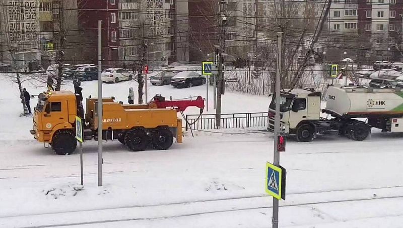 Тем временем МУП «Управление трамвая» сообщает, что на перекрестке улицы Калашникова и проспекта Строителей КАМАЗ-эвакуатор помогает вытягивать фуры, которые не могут подняться в гору.