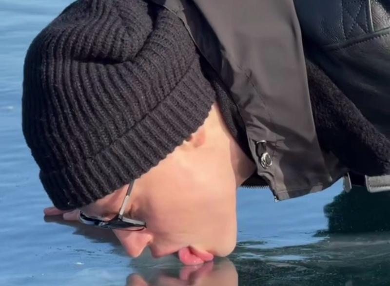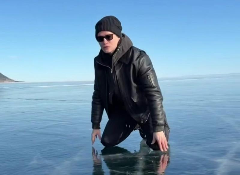 — Ну что, родные, попробуем самое чистое озеро в мире, Байкал, на вкус, — говорит певец и принимается лизать лед.